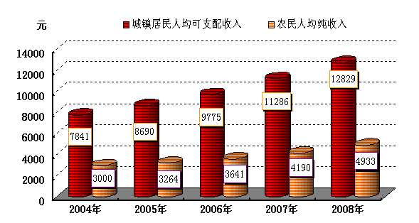 图9 2004—2008年我省城镇居民人均可支配收入和农民人均纯收入